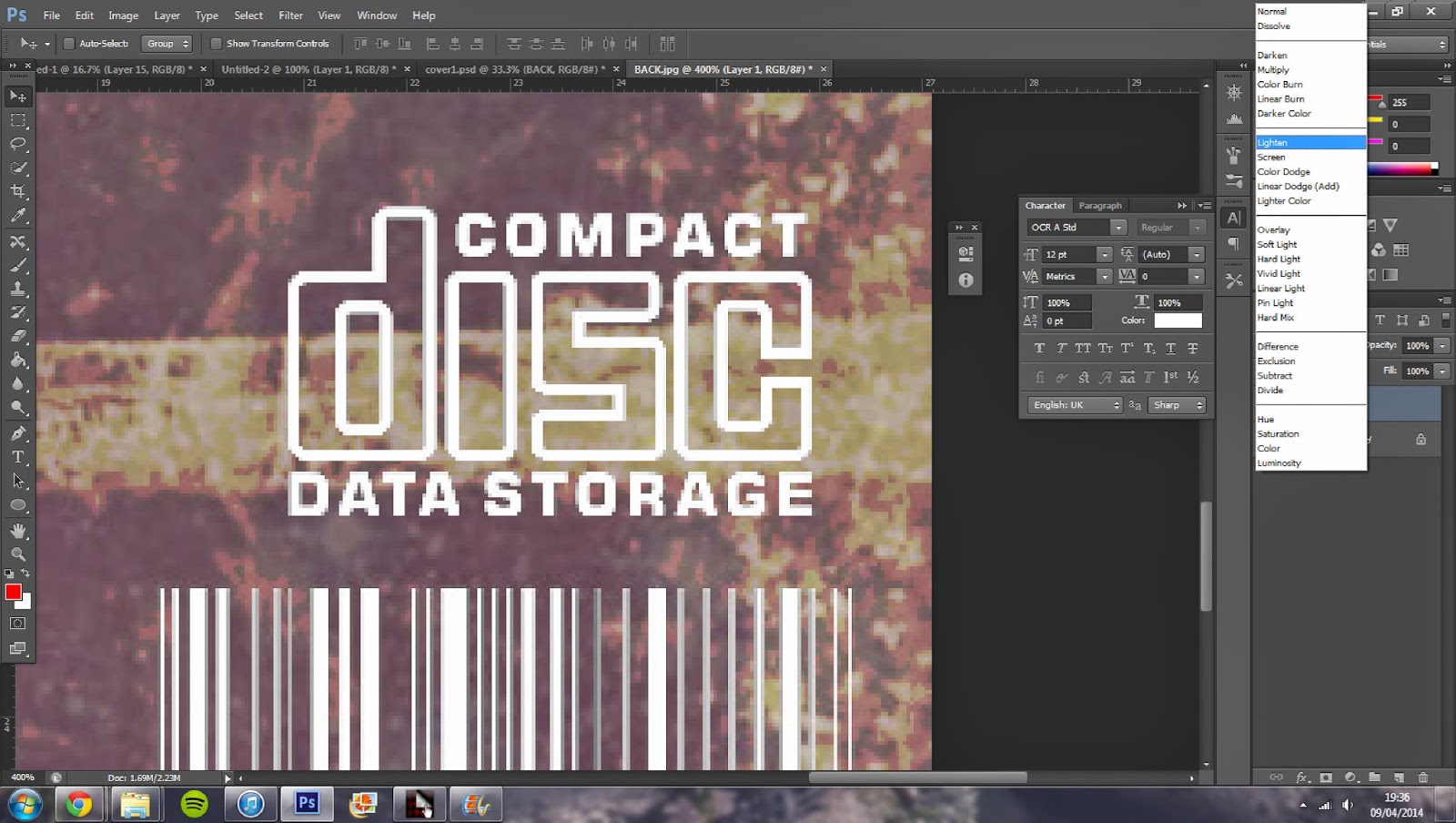 For the disk design I again worked on Photoshop placing the image I wanted as my main design on a design template especially for cd artwork. As you can see the continuity runs through on to this design using similar colours and the same font. The layout of the album title and the text around the edge of the disk was a difficult edit at first. I had only ever given text a curved effect on photoshop which is done simply by an effect choice within the text options. For the text to fit parallel with the cd edge the curve option didn't fit it right.
